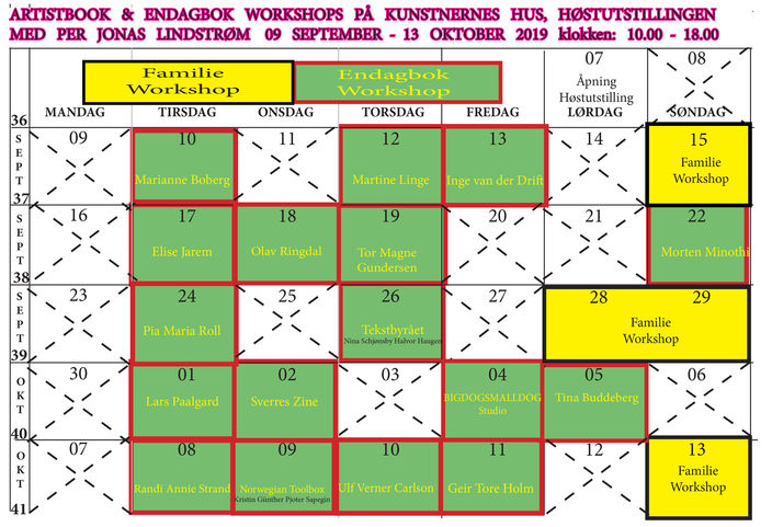 In the autumn of 2019 and the spring of 2020, I invited around 40 artists, filmmakers, musicians, and book makers, to individually make a one-day book with me at the exhibition spaces of Kunstnernes Hus in Oslo and ØKS in Fredrikstad. The books were developed through a mix of the artist's ideas, mutual cooperation, and dialog with the audience, and were produced during opening hours. On the weekends, I hosted open artist book workshops and family workshops. In total, around 20 000 spectators passed by the performance. A total of 50 books were made with the two groups of artists in the two different exhibition spaces.